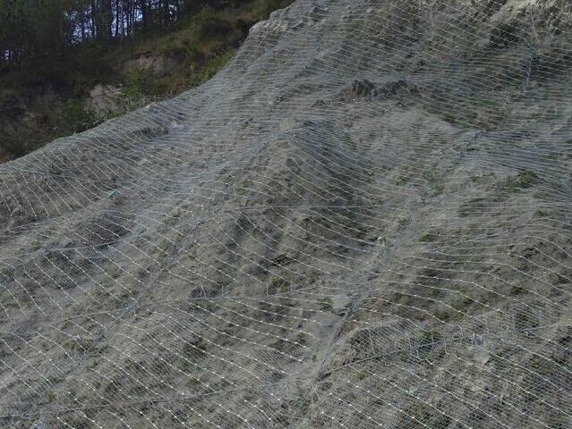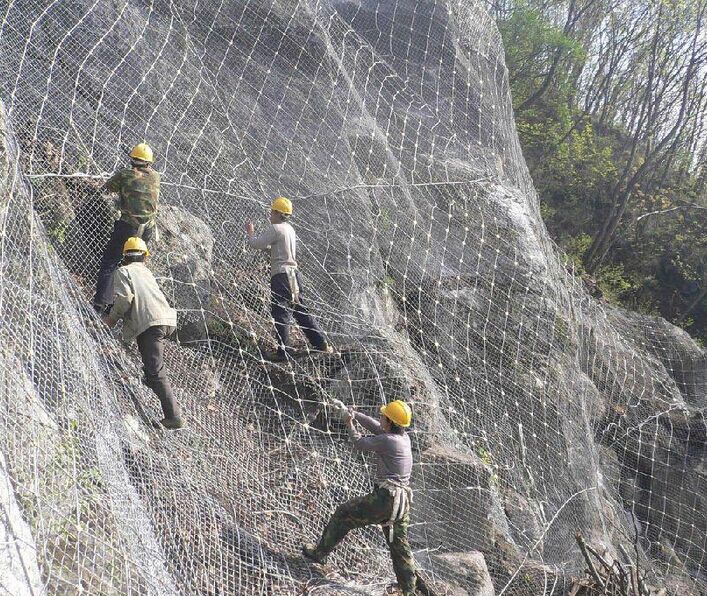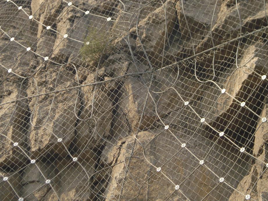 主動防護系統是以鋼絲繩網為主的各類柔性網覆蓋包裹在所需防護斜坡或巖石上,以限制坡面巖石土體的風化剝落或破壞以及為巖崩塌(加固作用),或將落石控制于一定范圍內運動(圍護作用)。是柔性防護網的一種。