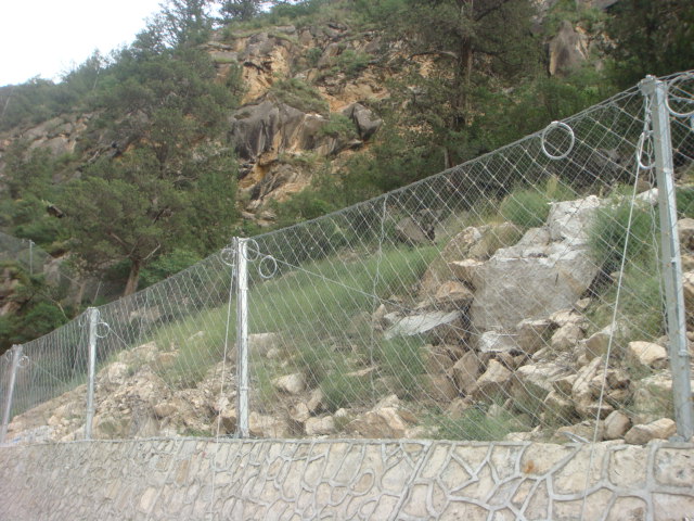 由鋼絲繩網或環形網(需攔截小塊落石時附加一層鐵絲格柵)、固定系統(錨桿、攔錨繩、基座和支撐繩)、減壓環和鋼柱四個主要部分構成。
